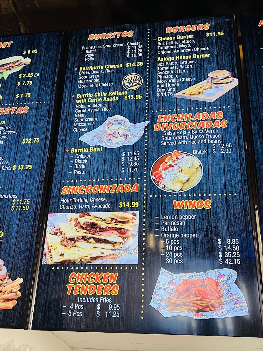 The menu showcases a tantalizing variety of dishes. Enjoy flavorful tortas like La Asadera or La Birriera, or indulge in a hearty burger, including the standout Asiago House Burger. For sides, try the crispy fries or savory jalapeño fries, all affordably priced.